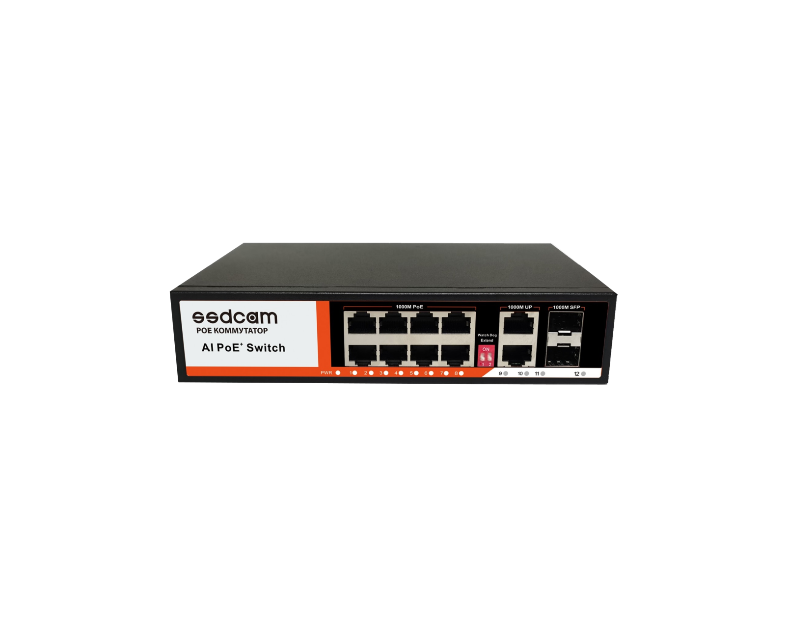 8 портов 10/100/1000 Мбит/сек RJ-45 с поддержкой Auto-MDIX, PОE, + 2 порта 10/100/1000Mbps RJ-45 Uplink + 2 порта 1000Mbps SFP, на порт 48V Max.,30 Вт (IEEE 802.3af/at POE+), общая мощность 150W, AC-220V (встроенный блок питания), функция WatchDog, 220x161x36 мм, вес 450 гр. Усиление передачи данных до 250 метров, путем снижения пропускной способности до 10Мбит/сек на каждый РОЕ порт, кроме портов Uplink.