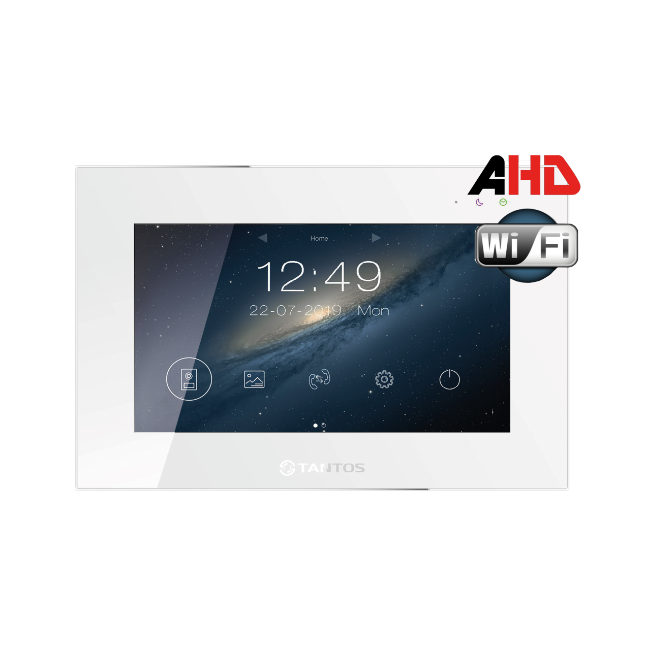 Монитор с поддержкой форматов AHD 1080р/720p или CVBS, с возможностью переадресации вызовов на мобильное приложение «vhOme», удаленный просмотр на смартфоне происходящего у вызывной панели, удаленное управление замками или воротами, подключенными к вызывным панелям.